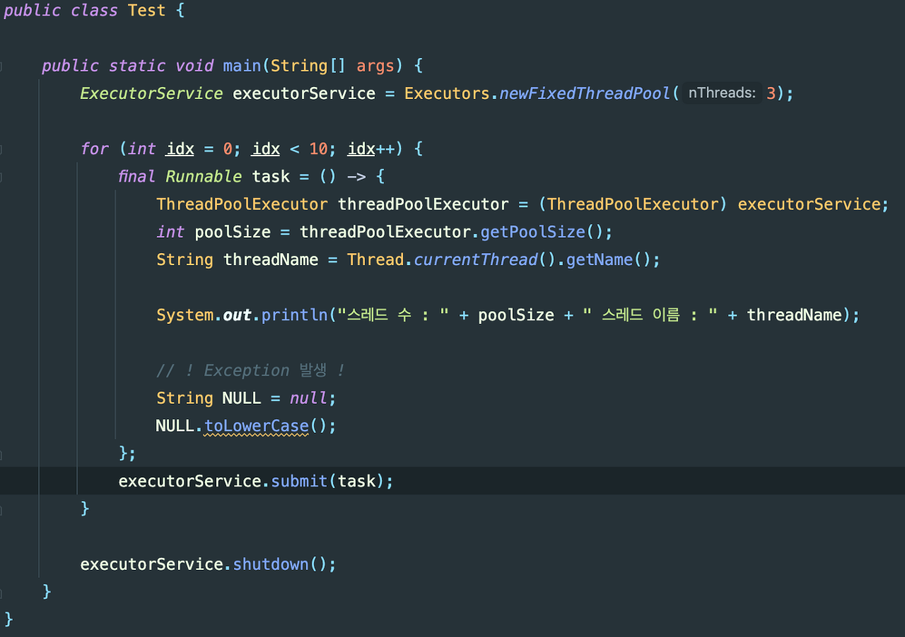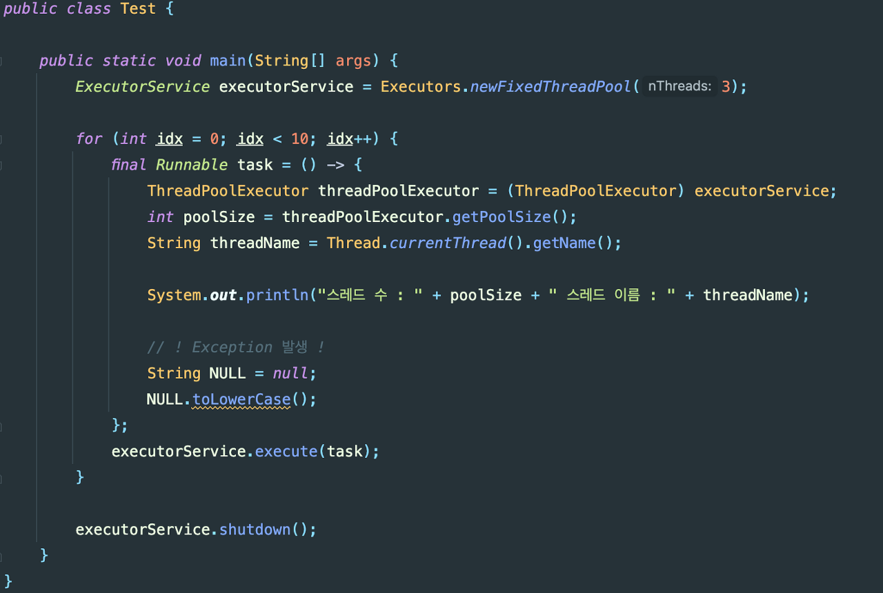작업 처리 도중 예외가 발생하더라도 스레드가 종료되지 않고 계속 다음 작업에 재사용되는 것을 확인할 수 있습니다.